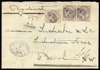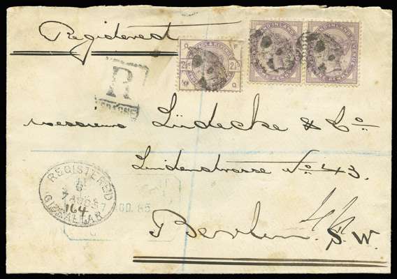 1885 (7 AU) registered cover from Gibraltar to Germany, correctly franked at 4½d (2½d postage + 2d registration) by 1881 GB 1d lilac (16 dots) x2 and 1884 GB 2½d lilac, cancelled in transit by individual strikes of Spanish obliterator with boxed "R / ESPAGNE" registration mark alongside. Gibraltar registered oval at lower left, overlapping sender's green ds. Bacsktamped at Cadiz (9 AGO), Madrid (10 AGO) and Berlin (13.8). Some cover faults (portion of envelope cut out from reverse, 2½d with added corner) but highly unusual. BPA cert (1978).