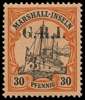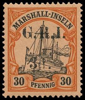 1914 (16 Dec) Marshall Is 3d on 30pf black and orange/buff, 5mm space from setting II pos. 6, showing the distinctive "faint d" variety which is known only from this position, very fine o.g. (= Gibbs "G.R.I." p. 119 no. 6c, rated at 10x normal). Rare.
