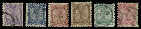 Life Insurance. 1891-98 set of 6 to 1s, wmk 12c, perf 12x11½, used. Typical perfs and centring, and ½d and 1d with corner creases, still far above average, most with fully dated cancel and very difficult to assemble thus. (cat £250)