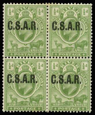 Railway Official. 1905 ½d yellow-green, opt "CSAR" (type RO1) towards top, block of 4, large part o.g. Slight creasing and a few lightly toned perfs, still fine appearance. A rare multiple. (cat £400) [N.B. the opt is placed at the top or bottom of the stamp depending on whether the central horizontal gutter margin was left attached to the top or bottom of the sheet prior to overprinting.]