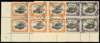 Official. 1908-10 "Small PAPUA" Wmk sideways perf 12½ 2d black and purple, 1s black and orange, perf "O S", in matching lower left corner blocks of six (3x2) showing variety "Rift in clouds" on upper right stamp (pos. 23), c.t.o. at Port Moresby "11 OCT 10". Attractive positional multiples, the 1s scarce.