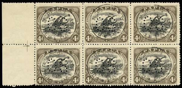Official. 1910-11 "Large PAPUA" 4d black and sepia, perf "O S", left marginal block of six (3x2) with centre guide, showing variety "Deformed d at left" on lower right stamp (R4/3), c.t.o. with individual strikes of Port Moresby "28 AUG 11" cds. A scarce positional multiple.
