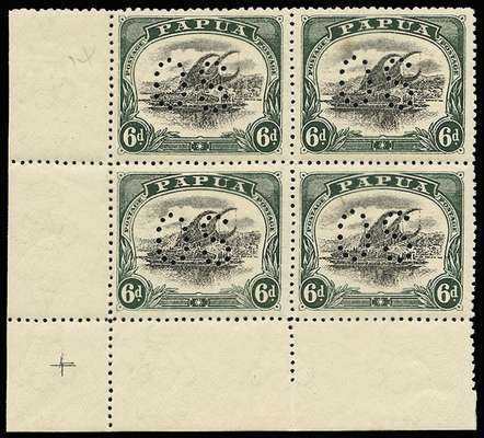 Official. 1910-11 "Large PAPUA" 6d black and myrtle-green, perf "O S", lower left corner block of four, unmounted o.g. One stamp with a minor gum tone, otherwise very fine and fresh. An attractive and extremely scarce unused multiple of this issue. (cat £360++).