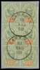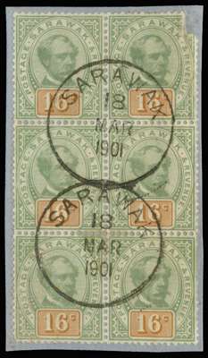 1888-97 16c green and orange, block of six (2x3) with good colour, used on piece with two very fine strikes of type D5 "SARAWAK" cds, dated "18 MAR 1901". Top right stamp sadly defective (missing corner) and bottom left stamp with a short corner perf but a very scarce used multiple of this value. (cat £540+)