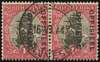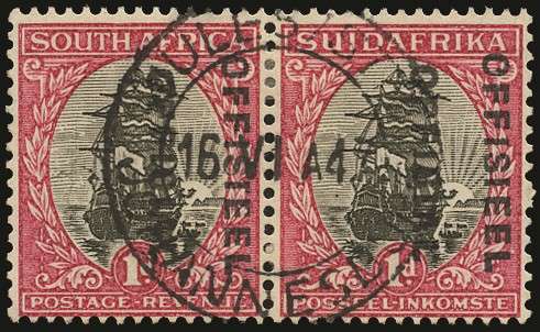 Official. 1930-47 "Set 6" (= 1931 issue) 1d "grey-black and carmine-rose" roto, SUIDAFRIKA one word, wmk inverted, SG type O2 opt (12½mm space), horizontal pair showing spectacular MISPLACED OPT (sideways to left, leaving the two words close together and transposed at right), neatly cancelled by central Johannesburg cds dated "16 VI 47". Plated as R4/1-2 from sheet no.4071, the right stamp with diagnostic opt flaw (dot in "O" of OFFISIEEL, misplaced from R4/3 !). A rare pair. Ex Matheson. [Union Handbook O21 V9]