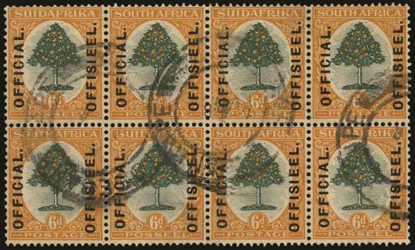 Official. 1926 (1 Dec) "Set 1" 6d green and orange, SG type O1 opt on London ptg, block of 8 (4x2), nicely used with legible strikes of "ROSEBANK CAPE" cds. A scarce multiple, in above average condition. Ex Matheson. [Union Handbook O4].
