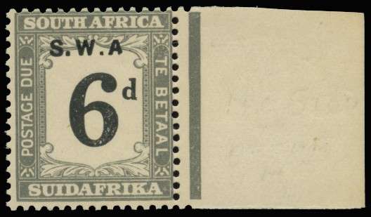 Postage Due. 1928-29 South Africa 6d black and slate (typo), type 10 "S.W.A." opt, right marginal, variety Without stop after "A" (R3/6), unmounted o.g. Scarce thus.