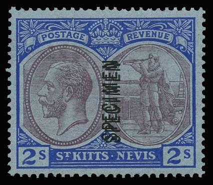 1921-29 Script wmk 2s purple and blue/blue, opt "SPECIMEN", error OPT DOUBLE, very fine large part o.g. A very rare and remarkable phenomenon, being one of very few recorded double specimen overprints on any De La Rue stamp. Although the size of the forme is unknown to us, it seems most unlikely that an entire sheet existed.