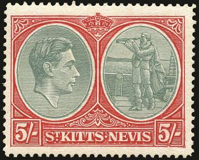 1938-50 5s bluish green and scarlet, ordinary paper (1945 printing), variety 'Break in value tablet frame' (R12/3), very fine large part o.g. Scarce. [N.B. This variety only occurs on printings between 1941 and 1945.]