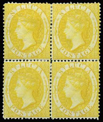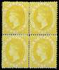 1864-76 (4d) yellow, wmk CC reversed, perf 14, block of 4, part to large part o.g. Odd shortish perfs, and upper right stamp with small thin, still an attractive multiple with lovely colour. Very scarce. (cat £520+)