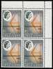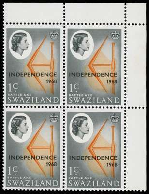 1968 Independence 1c yellow-orange and black, type 42 opt, variety WMK INVERTED, upper right corner block of 4, unmounted o.g. Scarce in this positional form.