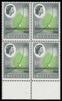 1968 Independence 3½c yellow-green and deep grey, type 42 opt, variety WMK INVERTED, lower marginal block of 4, unmounted o.g. (cat £200+)