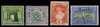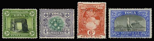 1897 Pictorial 3d black and yellow-green, 4d green and purple, 6d red, 2s black and ultramarine, wmk sideways except 6d (upright), each with type D4a finely impressed "CANCELLED" opt, very fresh colours with some o.g. A lovely and very rare group, used as printer's samples.