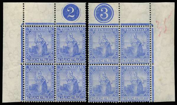 1904-07 2½d blue, two plate blocks of 4, respectively from the upper left (plate "2") or upper right corner (plate "3"), o.g. (stamps mostly unmounted). Latter with minor gum creasing (affecting one stamp) but an attractive and scarce pair.