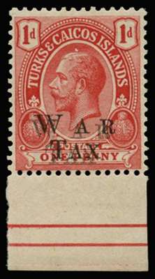 1919 War Tax 1d scarlet, type 42 "WAR/TAX" opt, ERROR OPT DOUBLE, lower marginal, very fine o.g. A spectacular example with wide separation.