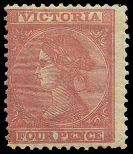 1867-81 4d rose "Laureate", wmk V over crown W19, perf 13, part o.g. Centred left, with minor gum browning and wrinkling, but lovely fresh colour in a pastel shade. Scarce in unused condition. (cat £130).