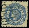 1867 (-81) 5s blue/yellow, lightly used with part "VICTORIA" barred oval (from Melbourne duplex). Tiny mark on NW corner perf, otherwise much above average for this key stamp. Only 2950 issued. (cat £425).