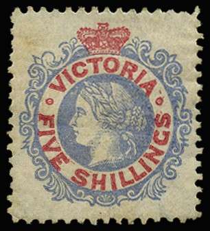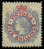 1867-81 5s grey-blue and carmine, perf 13, part o.g. Slight soiling and wrinkling but well-centred with good colour. Very scarce in unused condition, and much above average. (cat £650).