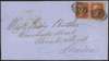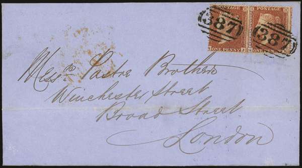1855 1d Red brown Pl.4 (Wmk. Small Crown, Perf.16). Very fine used horizontal pair lettered SJ-SK beautifully tied to an entire by crisp Huddersfield "387" numerals. Addressed to London with a blue Huddersfield cds for JU.19.1855 and a London receiving cds for the following day on reverse. Spec. C4(1).