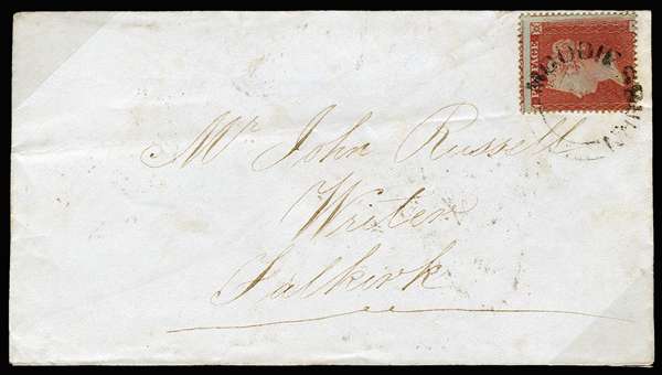 1855 1d Red-brown (Wmk. Small Crown, Perf 16). Very fine envelope sent from Moodiesburn to Falkirk bearing a 1d red-brown (SG 17) neatly tied by a "MOODIESBURN" Scots local cancellation (Type XX) leaving a clear profile. Backstamped by a crisp Glasgow transit cds for MY.7.1855, and a Falkirk arrival cds for the same day. Alcock scarcity rating F. Ex. "Claymore".