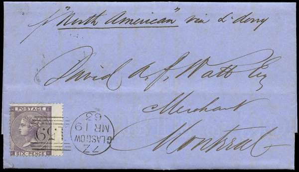 1859 Transatlantic mail (Allen Line). Very fine single rate entire from Glasgow to Montreal, Canada prepaid by a 6d deep lilac Pl.3 tied by a Glasgow "159" duplex for MR.19.1863, Montreal C.E. receiving cds on reverse for AP.6.1863. Endorsed "per North American via L'derry" but actually carried by the "Nova Scotian", the "North American" due to sail the following week. Exhibition Quality.