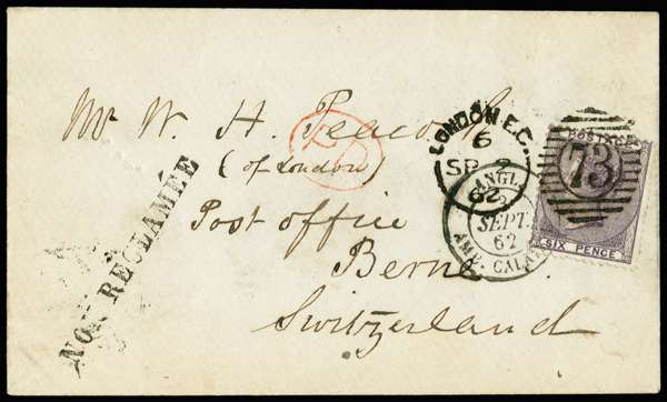 1862 Overas mail. Very fine cover to Berne, Switzerland prepaid with a 6d deep lilac, neatly tied by a London E.C. "73" duplex for SP.2.1862 and a Calais transit cds for the following day, with a Swiss "NON RECLAMÉE" handstamp at left indicating the letter was never collected. Backstamped with a Berne arrival cds for the 4th. Most attractive.