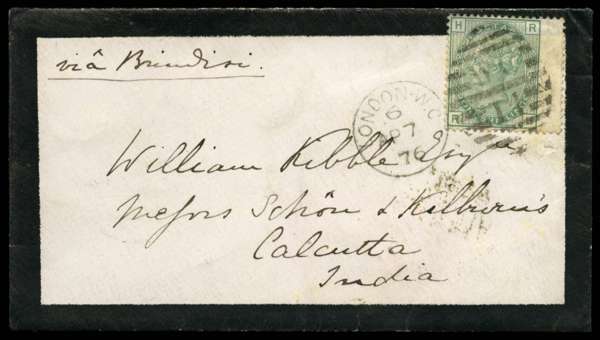 1876 Overseas mail. Very fine mourning envelope from London to Calcutta routed via Brindisi, prepaid by a 1s Green Pl.12 neatly cancelled by a London W.C. duplex for AP.7.1876. Sea Post Office and Calcutta arrival cds's on reverse for 14th and 29th April respectively.