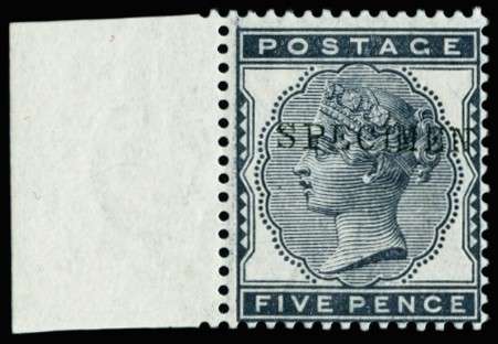 1880 5d Indigo. Very fine unmounted o.g. left hand marginal example overprinted "SPECIMEN" type 9. Spec. K6s.
