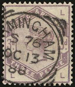 1883 3d Lilac. Very fine used example neatly cancelled by a crisp Birmingham squared circle cds for OC.13.1888.