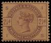 1884 2 1/2d Colour trial. Very fine unused o.g. perforated example lettered IS, printed in purple on buff, gummed, unwatermarked paper.