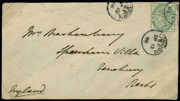 1886 GB Used Abroad. Very fine naval bag cover sent by Captain J W Brackenbury of HMS Hyacinth stationed at Coquimbo, Chile and addressed to his wife Mrs Brackenbury, Newbury, Berkshire, England. Bearing a 4d dull green (SG 192) cancelled upon arrival in England by London transit cds's for SP.12.1886. Backstamped by a Newbury arrival cds for the following day. A few peripheral faults as is the nature of these very delicate envelopes, nevertheless an attractive GB Used Abroad Franking. Offered with an additional photocopy of the matching outgoing cover sent to Capt. Brackenbury, HMS Hyacinth, Coquimbo, Chile via Lisbon dated August 13th 1886.