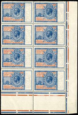 1911-20 1s Light blue and red Post Office Savings Bank Receipt for Deposit of One Shilling. Very fine unmounted o.g. right hand corner marginal vertical block of eight. Top teo stamps thinned and some creasing in lower margin, nevertheless a very rare multiple, believed to possibly be the largest surviving piece.