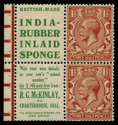 1924 1½d Red brown advertising booklet pane. Superb unmounted o.g. part booklet pane missing the right hand vertical pair of adhesives, consisting of two advertisement labels with "India Rubber Sponge/R.G. Mc.Kinlay" advertisements in green and two stamps. A presentable example of this very rare and most sought after booklet pane. Spec. NB15(72). Cat £5000.