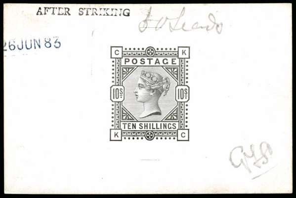 1883 10s Die Proof. Very fine proof printed in black on white glazed card (92 x 60mm), endorsed "AFTER STRIKING", dated "26 JUN 83" with manuscript annotations "JV Leads" and initialed "GFS". Scarce. Ex. "Verus". Cat £3,750