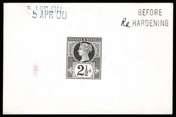 1886 21/2d "Jubilee" Die proof. Very fine die proof printed in black on white glazed card (92 x 60mm) endorsed "BEFORE RE-HARDENING" and dated "5 APR 00". Scarce. Ex. "Aureum".