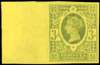 1887 3d Jubilee Colour Trial. Very fine imperforate left-marginal example printed in green on yellow gummed, Crown-watermarked paper. Fine and rare. SG 203