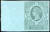 1887 3d Jubilee Colour Trial. Very fine imperforate left hand marginal example printed in green on blue, gummed, Crown watermarked paper. A stunning example of this great rarity. SG 203var