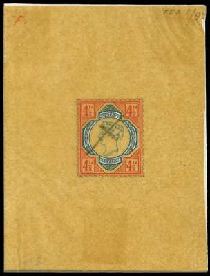 1892 4½d "Jubilee" Essay. Very fine hand painted essay in red & green with details of the design highlighted in Chinese white and cancelled with a manuscript pen cross, executed on a piece of tracing paper (62 x 82mm) lettered "F" and dated "FEB 1.92". One of a series of 10 essays produced by DLR for the new 4½d value. A spectacular and unique essay in the issued design and colour. Ex. DLR Archive & "Aureum".
