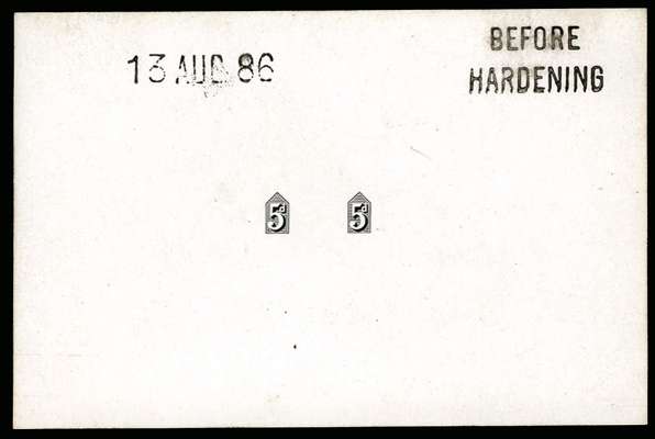 1886 5d "Jubilee" Duty Plate Die Proof (Die I). Very fine duty plate proof printed in black on white glazed card (92 x 60mm) endorsed "BEFORE HARDENING" and dated "13 AUG 86". Scarce. Ex. "Aureum".