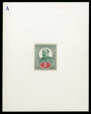 1901 2d Composite "Paste Up" essay of the Victorian "Jubilee" series. A spectacular Series "A" essay with a lithographed three-quarter portrait of King Edward VII mounted on thick card (78 x 100mm) endorsed "A" at top left. A magnificent essay and exhibition piece, believed to be one of only two or three examples in private hands. Ex. "Minoru".