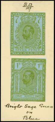 1911 7d & 1s Hentschel essays. Two very fine examples printed in sage green on blued paper, mounted together on thin white card endorsed "SD/19" and "Bright Sage Green on Blue". Scarce.