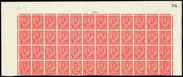 1912 1d Scarlet (Paper Trial). Very fine unused imperforate block of 48 from the top four rows of the sheet complete with full sheet margin numbered "70". Printed on John Alllen Special Finish paper, vertical fold through column 6 and between columns 9 and 10 as to be expected with such a large piece, nevertheless a very scarce and impressive multiple. Cat. £6720.
