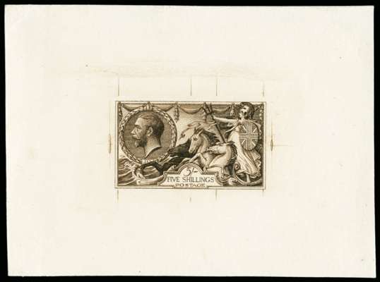 1912 5s "Seahorse" Die Proof (State b). Very fine example printed in Sepia brown on soft thick card (94 x 69mm) showing guide lines outside design. A very rare proof. Ex. Hassan Shaida. SG401var, Cat £50,000
