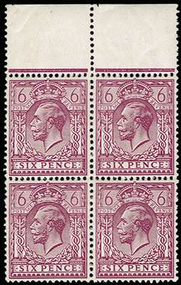 1924 6d Reddish purple (C). Very fine unmounted o.g. top marginal block of four with watermark Inverted & Reversed, the variety clearly showing in the sheet margin. Scarce multiple.