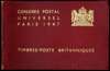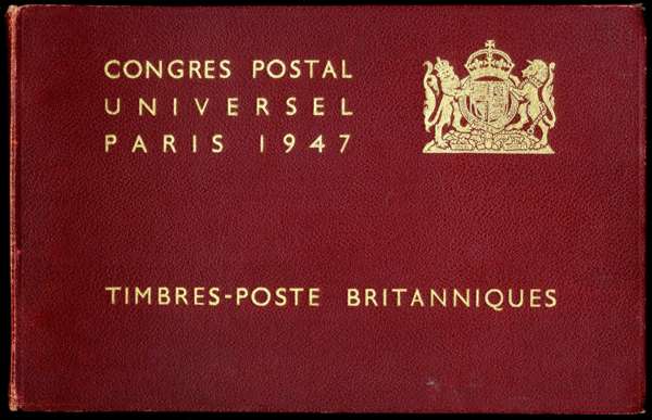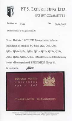 1947 Universal Postal Union Congress. Very fine presentation album within a red binder (320mm x 210mm) containing twenty one pages printed in red numbered 1-22 plus an additional page (minus pages numbered 13 & 14). the first few pages detailing a brief history of the British postal system since 1661, Page 9 bearing a 1937-47 ½d-1s set of ten definitives (SG462s-475s, Excluding 11d) and three "Arms" High values (SG476bs, 477s & 478bs). Page 10 bearing a 1940 ½d-3d Centenary set of six (SG479-484s), Page 11 bearing a 1946 Peace set (SG491-2s), Page 12 bearing a Postage Due set of eight (SGD27-34s) with pages 15-22 each with Postal Stationary (2d Postcard, 2d Reply card, 2½d Lettercard, 2½d Stamped envelope "A" size, 2½d Stamped envelope "Commercial" size, 6d Air Letter, 1½d Forces Letter & 5½d Registered Letter Envelope. All stamps and postal stationary overprinted "SPECIMEN" similar to type 9. A magnificent presentation album of the utmost rarity. 2022 PTS Cert.