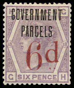 1883 6d on 6d Lilac "Government Parcels" Essay. Very fine unused o.g. example lettered GH, with trial overprint Type B in black. Very rare only six examples produced. SG162var, Cat £11,000