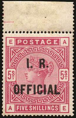 1890 5s Rose (I.R. Official, White paper). Fine unused large part o.g. top marginal example lettered AE showing "Raised stop" variety. Showing corner damage at lower left caused by crease nevertheless a presentable example of this rare departmental variety accompanied by a 1939 RPS Certificate. Spec. L7(2)a. Cat £14,000. Ex Michael Astley Collection.