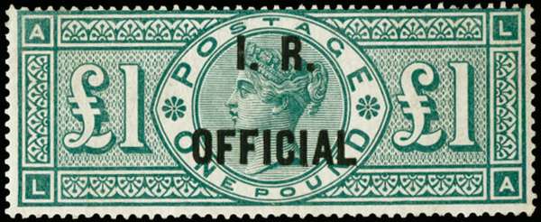 1892 £1 green (I.R. Official). Very fine unused o.g. example of this rare departmental issue lettered LA, accompanied by a 2004 BPA Certificate. SG O16, Cat £12,500
