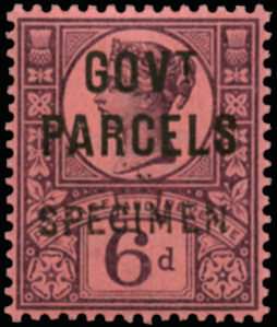 1887 6d Purple/Rose-red (Govt. Parcels). Very fine unmounted o.g. example overprinted "SPECIMEN" type 15. An attractive example of this scarce specimen. Spec. L27s. Ex Michael Astley Collection.