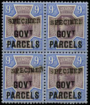 1888 9d Dull purple and blue (Govt. Parcels). Superb unmounted o.g. block of four overprinted "SPECIMEN" type 9. Spec. L28s. Ex Michael Astley Collection.